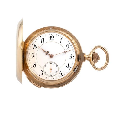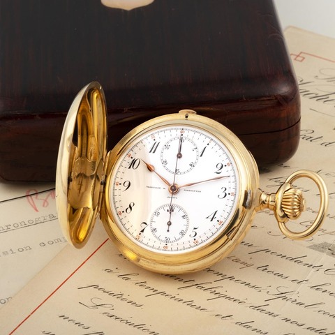 A very fine and rare, 18k gold, manual wind hunting-case, keyless-winding, pocket clock-watch, with subsidiary seconds at 6. Minute-repeater on two steel gongs by two hammers (activated by slide at 6 o’clock). Grande Sonnerie (position lever of “Silence” and “Sonnerie” at 12 o'clock). Twin-barrel differential-winding.