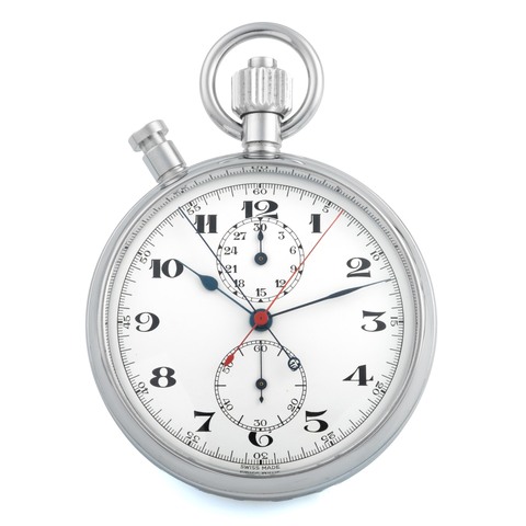 A fine and large, stainless steel, manual wind keyless pocket lever Chronometer with split-seconds chronograph and instantaneous 30-minute recorder. Blue steel spade hands.