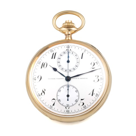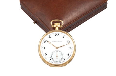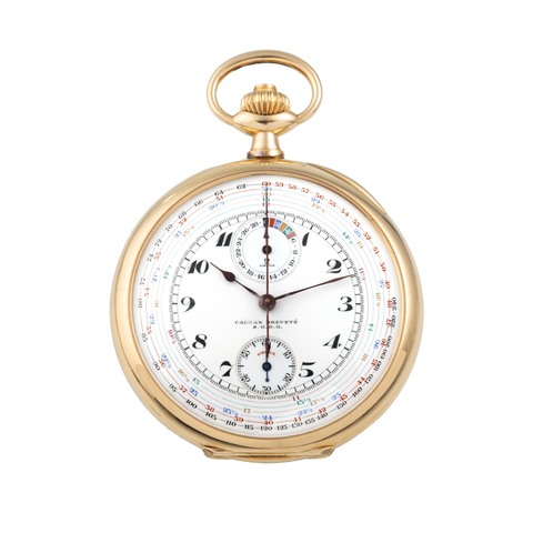 A very fine and elegant, 18k gold, manual wind open-face, keyless-winding pocket watch, silver gilt dial with subsidiary seconds at 6, Breguet steel hands. Minute-repeater on two steel gongs, Half-instantaneous calendar à guichets so-called Calendrier américain or Quantième en ligne. Date of the month (aperture at 12 o'clock, in the centre), day of the week (aperture at 12 o'clock, on the left), month of the year (aperture at 12 o'clock, on the right).