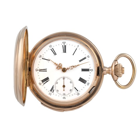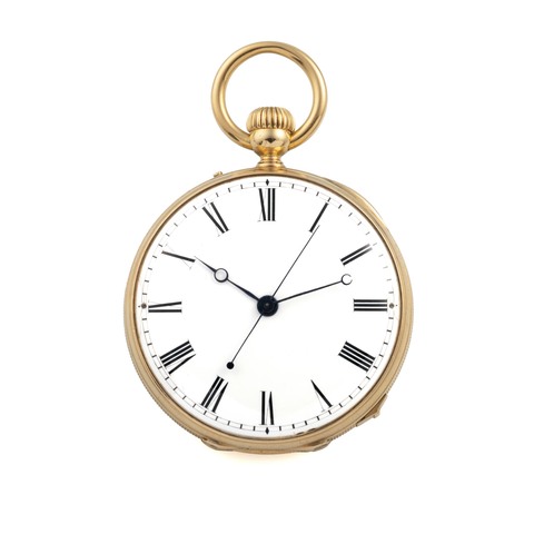 A very fine, 18k yellow gold, manual wind open-face, keyless pocket watch, first quality minute-repeating. white enamel dial with blue steel spade hands.