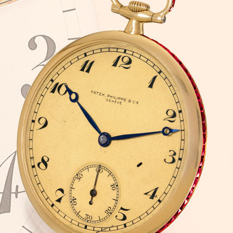 C. Three-body, polished, calibré ruby-set band and pendant, polished curved bezel, polished back. D. Frosted gilt with black Breguet numerals, outer minute track, subsidiary seconds. Blued steel Breguet hands. M. 37 mm (16.5???), rhodium-plated, "fausses-cotes" decoration, 18 jewels, wolf's tooth winding, straight line lever escapement, cut bimetallic compensation balance with 8 adjustments, blued steel flat balance spring, index regulator. Dial, case and movement signed. Diam. 44 mm.
