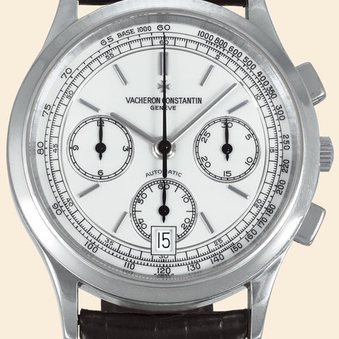 C. Three-body, "bassine pincée", polished. D. Matte silver withArabic numerals, outer minute track with Arabic fiveminutes/seconds and fifth second timing scale, 30-minuteregister at 12, subsidiary seconds at 6. Gold "Breguet" hands.M. Cal.18??? 26/12, rhodium-plated, 23 jewels, straight-line leverescapement, cut bimetallic compensation balance, Breguetbalance-spring, Vacheron & Constantin micrometer regulator(Patent CH 101652, registered 1 November 1923).Dial, case and movement signed.Diam. 46 mm.