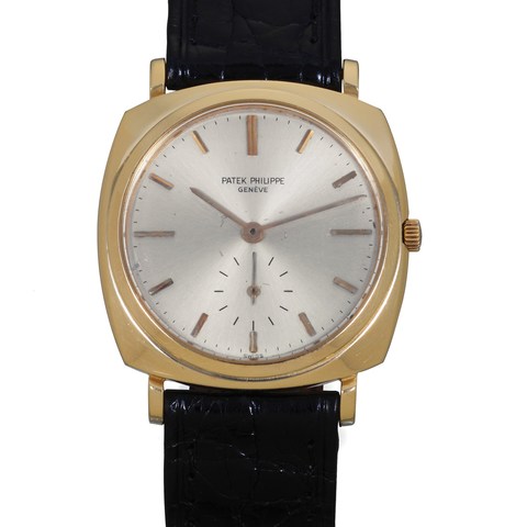 C. Two-body, solid, polished, hinged case back with initials: "GSE", circular straight lugs. D. Matte silver withapplied yellow gold Breguet numerals, subsidiary seconds dial. Yellow gold "feuille" hands. M. Cal. 11''', rhodiumplated,"fausses cotes" decoration, 18 jewels, straight line lever escapement, cut bimetallic compensation balanceadjusted to 8 positions, Breguet balance-spring.Case and movement signed "Patek Philippe", dial signed Tiffany & Co.Dim. 26 x 37 mm. Thickness 9 mm.