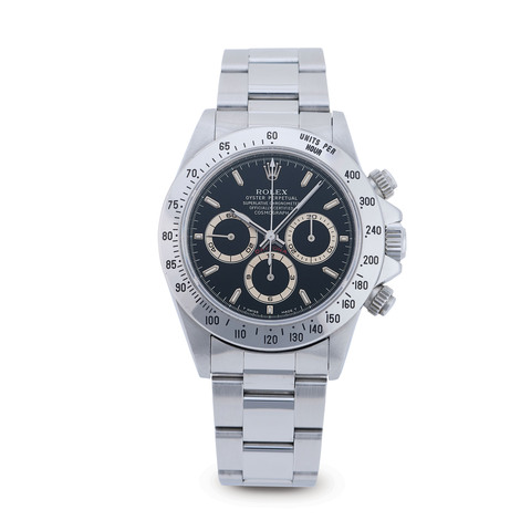 A fine, stainless steel, self-winding chronograph wristwatch with black dial, 3 registers and tachometer bezel.
