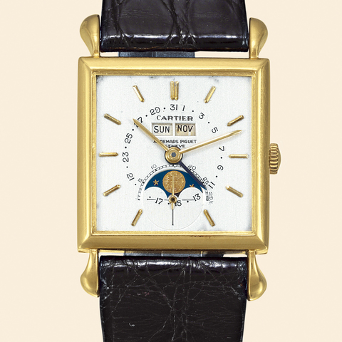 C. massive, polished, teardrop lugs. D. mat silver with applied gold indexes + auxiliary dials for the seconds, the days of the month, of the week, the months and the age of the moon, aperture for the lnations. "Bâton" gold hands. M. 9 1 /2"' signed Audemars Piguet, rhodiumed, "fausses côtes" decoration, 18 jewels, lever escapement, monometallic balance adjusted to temperatures and 4 positions, self-compensating Breguet balance-spring. Dial, case and movement signed. In good condition. Dim. 25 x 25 mm.