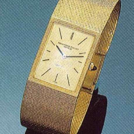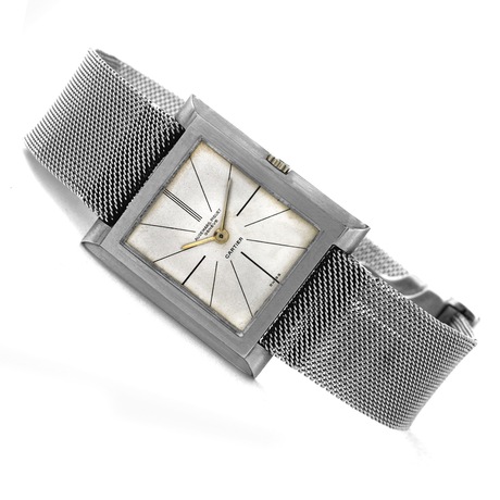 C. Rectangular shaped, brushed, stepped bezel, with platinum woven mesh bracelet. D. Silvered dial with painted baton indexes. Platinum baton hands. M. Cal. 2003, rhodium plated, fausses cotes decoration, 17 jewels, lever escapement, monometallic balance adjusted to temperatures and 4 positions, self compensating flat balance spring. Dial, case and movement signed Audemars Piguet, dial signed Cartier, case stamped with Cartier numbers. Dim. 26 x 31 mm.