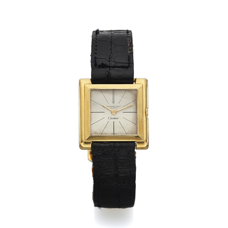 C. Three-body, cushion-shaped, solid, polished, inclined bezel. D. Matte silver with painted radial Roman numerals. Black feuille hands. M. 9 1/2???, rhodium plated, fausses cotes decoration, 18 jewels, straight-line lever escapement, Gyromax balance adjusted to heat, cold, isochronism and 5 positions, self-compensating flat blued steel balance-spring, shock absorber. Dial signed Cartier, case and movement signed. Dim. 32 x 30 mm. Thickness 6 mm.