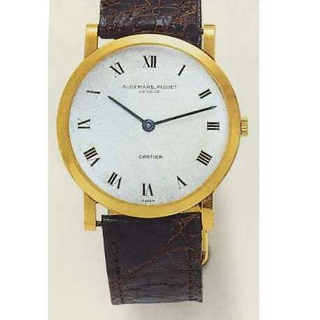 C. Rectangular shaped, polished and brushed, stepped bezel, the case back engraved ?FOR A LONG LONG TIME.? D. Off-white dial with painted baton indexes. Yellow gold baton hands. M. Cal. 2003, rhodium plated, fausses cotes decoration, 17 jewels, lever escapement, monometallic balance adjusted to temperatures and 4 positions, self compensating fl at balance spring. Dial, case and movement signed Audemars Piguet, dial and bracelet signed Cartier, case stamped with Cartier numbers. Dim. 26 x 31 mm. Approx. overall length: 170 mm.