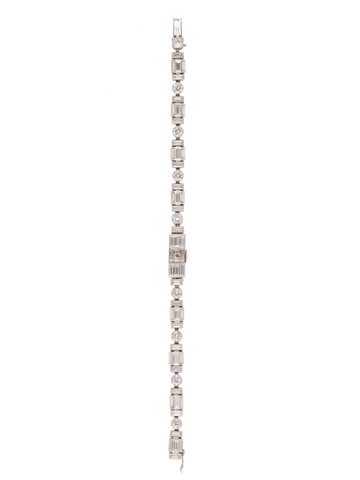 C. massive, polished, back winder, cover and lugs set with 21 baguette and 20 round diamonds. D. mat silver with applied gold indexes. "Moderne" gold hands. M. 2 3/4"' signed Audemars Piguet, rhodiumed, baguette, " fausses côtes" decoration, 17 jewels, lever escapement, monometallic balance adjusted to temperatures and 4 positions, self-compensating flat balance-spring. Dial, case and movement signed. In good condition. Dim. 11 x 26 mm. Total length of the bracelet: 16,5 mm.